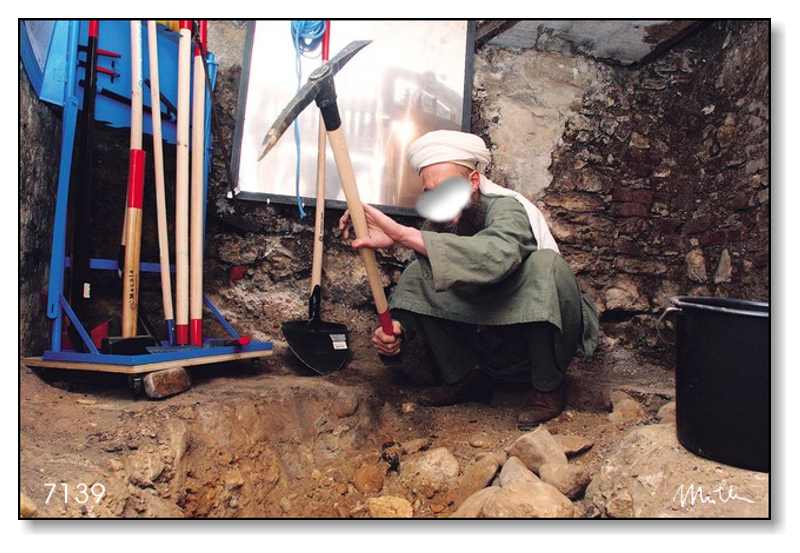 . Beginn der Freilegung des Basistunnels im Keller der Werkstaḍ Graz, Sporgasse - 13. August 2004 . Als Tunnelgräber legst du (physisch betrachtet) den Basistunnel, also die verschüttete, unterirdische Verbindung zwischen Graz und Gradec frei. Du gräbst bis du einen Kübel mit Aushub gefüllt hast. Dann bringst du deinen Aushub hinaus auf die Strasse und leerst ihn in die Tasche auf deinen Esel und transportierst nunmehr deinen Aushub als Eseltreiber bis zum Zwischenlager wo du deinen Aushub ausleerst. Du hast damit beigetragen, den Basistunnel freizulegen und letztlich das Endlager zu erhöhen. |