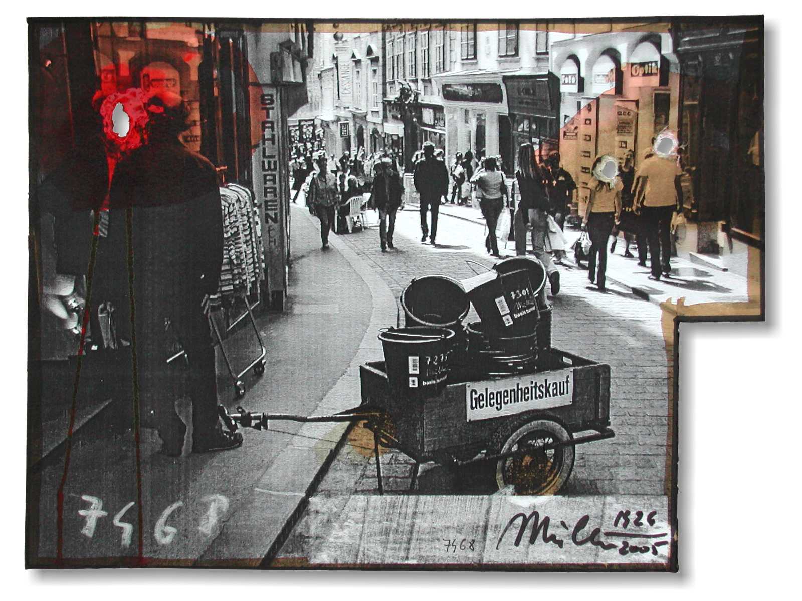 . Thematisch unterschiedliche Projekte; meist Laser,- oder Tintendruck auf Papier / Katrton und danach "gelüftet", teils Vorstudien zu Tafelbildern. "Skizzen" sind selten größer als Din A4, meist kleiner. . Gewisse Objekte, wie etwa Kübel, Heindl, Taschenspiegel können im Gelegenhietskauf erworben werden.