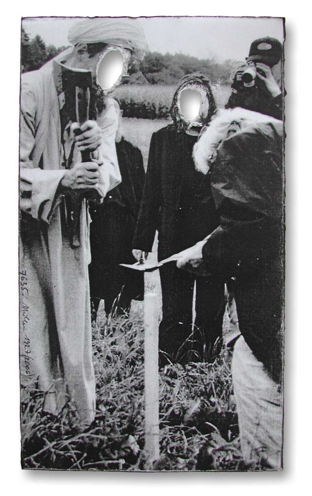 Die Durchreibung (gelüftet) als Manifestation der Abwesenheit der Bildfläche. Ein Hinweis, auf den Bereich, der über die sinnliche Erfahrungen hinausreicht. Luft ist eines der Elemente der Malerei. Die Durchreibung produziert Abwesenheit der Bildfläche. Mittels solcher Lüftungen (Durchbohrungen, Herausschneidungen, Ausbrennungen usw.) in der Bildfläche entsteht ein Leer-Raum als eines der .Elemente der Malerei. Es handelt sich dabei nicht um ein "Hinzutun" sonder nun ein Wegnehmen durch welches nicht nur die Umgebung des Weggenommenen eine neue Bedeutung bekommt, sondern ein Schutz für die undarstellbare spirituelle Realität der Person, an deren Realität (die Seele) nur mehr transzendent hingewiesen wird. Luft gehört wie Feuer und Wasser zu den flüchtigen Elementen der Malerei, doch das Loch präsentiert auch das "Nichtsein" (La Makaan) bzw. die Abwesendheit eines Malgrundes so wie im Pullover das durchgescheuerte Stück, welches in das Grab mitgenommen wird und dort seine Realität zurückbekommt .. ... mehr. Technisch gesehen - sofern der Malgrund Papier ist - habe ich solange gerieben bis ein Loch entstand; bei Leinwandgemälden habe ich Löcher in die Leinwand geschnitten und bei Dias oder Negativen mit dem Lötkolben transzendiert.