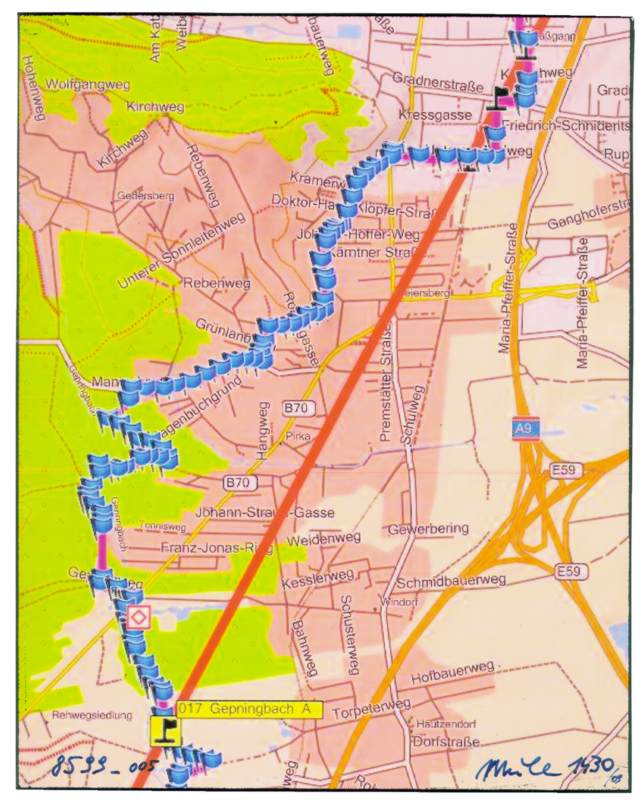 Das ist die gerade Linie, welche sich zwischen Graz und Gradec erstreckt. Nach digitaler Berechnungen ist die Linie 67,9 lang, doch generieren digitale Karten unterschiedliche Längenangaben. Unter Berücksichtigung von Berg und Tal kommt man auf 70 km.