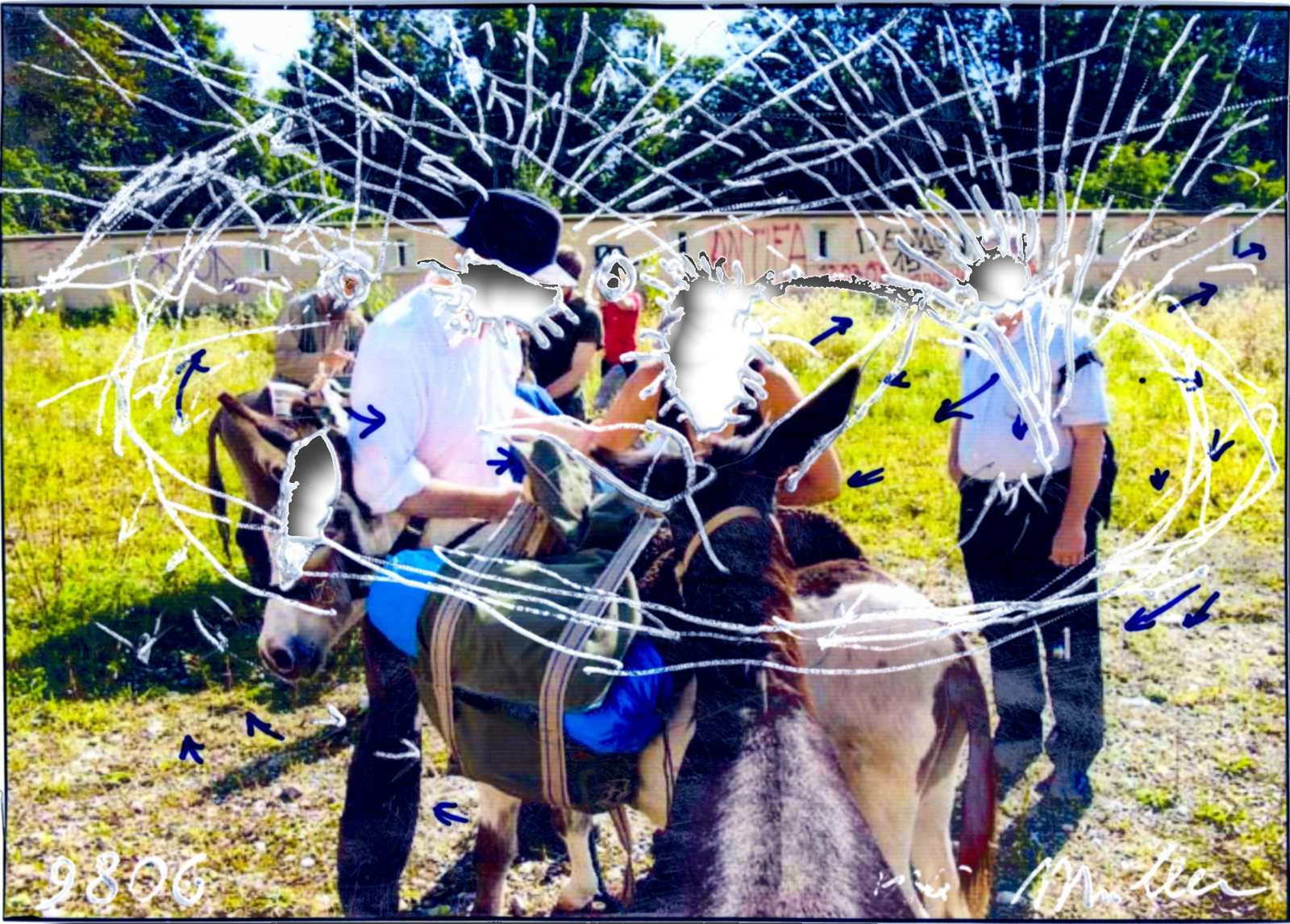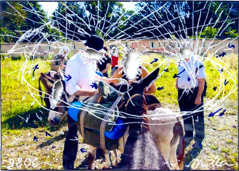 . Die Lüftung bedeutet transzendieren der physischen in die spirituelle Dimension. Wenn die Mouse über das gelüftete Bild geführt wird, dann ist das tote Bild zu sehen. Warnung an Spiegelputzer: Photographien können sicherlich an Erlebnisse erinnern bzw. Vorgänge dokumentieren; für den Spiegelputzer aber kann das Photographieren währen des Transportierens seines Aushubs einen spirituellem Schaden verursachen indem die mit dem Photographieren okkupierte Seele von der Orientierungslinie weit abkommen kann. Die Orientierungslinie verläuft nicht nur in der Landschaft über dem Basistunnel, sondern vor allem in der Seele und oftmals ist der Pfad sehr schmal und kann unerwartet aus den Augen verloren gehen. Vom Pfad abzuweichen kann den transportierten Aushub zum Spiegelputzen unbrauchbar machen. Kleine Bilder, unterschiedlicher Thematik, gekratzt und/oder durchgerieben, usf. meist Tinte(nstrahldruck) auf Papier, Photographie bearbeitet mittels Lüftung, Ritzung, Farbe usf. Digitale Sammlung von Gemälden, bei welchen das Mouse-Symbol über dem Gemälde eine Photographie vor ihrer Lüftung, bzw. Durchreibung zeigt. Das Abbilden beseelten Lebens - speziell des Gesichts - kann der Seele Schaden zufügen. Gelüftete Photopgraphien habe ich teilweise mit der "Mouse-Over"-Funktion geschützt, um zu zeigen, dass es bei den Durchreibungen nicht um Zerstörung, sondern um spirituellen Schutz geht. . Als Eseltreiber transportierst du deinen Aushub aus dem Basistunnel am Rücken eines Esels vom Tunneleingag in Graz oder in Gradez bis zum Zwischenlager. Dieser Aushubtrabsport - eines selbst gesuchten Eseltrecks entlang der Orientierungslinie - kann dir ein unvergleichliches Erlebnis sein. Hast du aber die Absicht Spiegelputzer zu sein, erlebst du deinen Aushubtransport als heiklen sakralen Prozess. Solltest du keinen eigenen Esel besitzen, kannst du dir (bis es eine Betriebseigene Eselzucht gibt) irgendwo einen Esel mieten oder kaufen. Du kannst allein mit einem Esel oder in der Gruppe mit mehreren Eseltreibern bzw. Esel transportieren. |