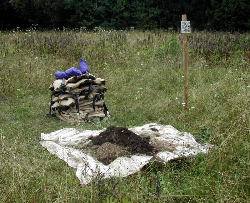 Der ursprünglich installierte Zaun um das Zwischenlager wurde von den Grundstückseigentümern entfernt, so dass bei hohem Gras nur Pfahl mit dem Codetafel erkennbar war. Der dunklere Aushub (Schürfmüll) am Bild ist hier gerade frisch vom Tunneleingang in Slovenj Gradec über den Aushub vom Tunnelzugang Graz geschüttet worden. Der Gewinn muss von den Spiegelputzer aus dem Aushub des Basistunnels ausgesiebt werden. Im Hintergrund gestapelte Packsättel.