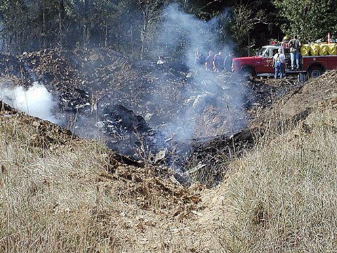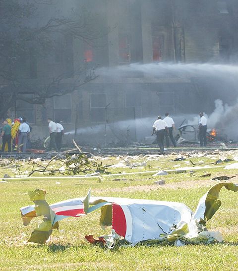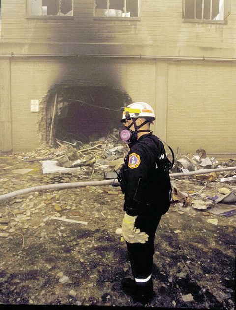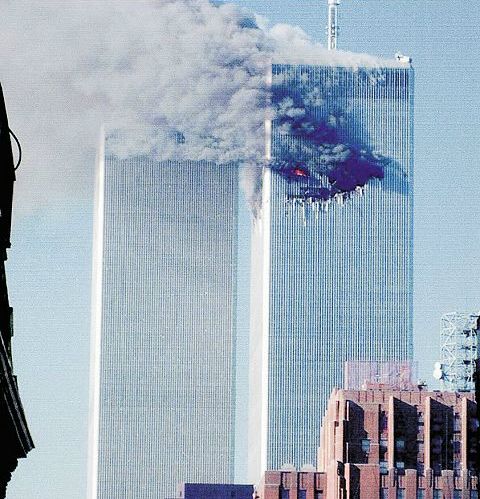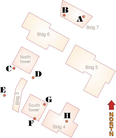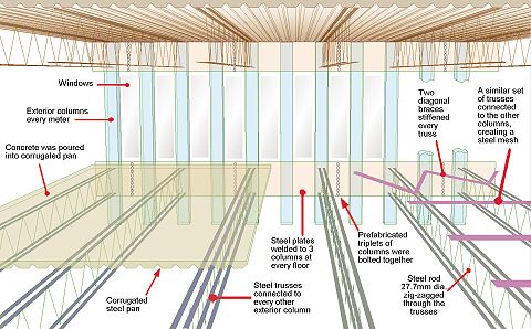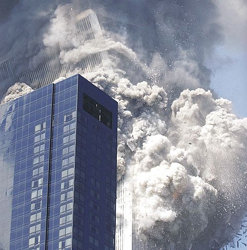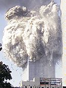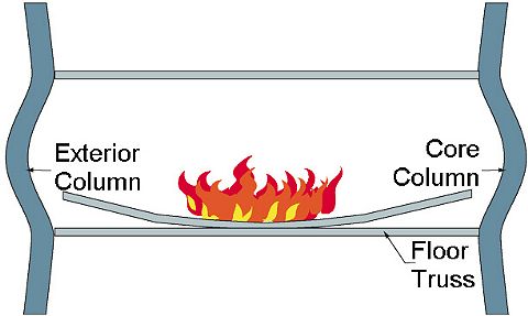 Der Ausschnitt zeigt die 45 zerschnittenen äusseren Säulen. Das sind nicht mehr als rund 20% der 237 mit feuerhemmendem Material ummantelten Säulen. 80% blieben stehen. Die Türme waren auf den Aufprall derartiger Passagiermaschinen ausgelegt, ebenso wie auf die wuchtigen Winterstürme. Man sieht die schwarze Höhle, in der kaum noch Feuer auszumachen ist. Die Feuerwehr hat die 73. Etage bereits erreicht und fordert 3 Mannschaften zum Löschen der kleineren Restfeuer an. Auf dem Bild sieht man Menschen, die zwischen den Säulen ins Freie schauen. Die Bush Regierung behauptet, das brennende Kerosin habe die Türme später zum Einsturz gebracht. Das hat es in 120 Jahren der Technik des Stahlskelettbaus noch nie gegeben, dass Feuer derartige Gebäude zum Einsturz bringen konnte. Die auf dem Stockwerk zu sehenden Zeugen empfinden nicht die Hitze, warten auf Rettung, die Feuerwehr will sich ans Löschen machen. Der Nordturm wird als erster getroffen, bleibt jedoch bis 10:28 stehen. Der um 9:03, folglich später und weniger schwer getroffene Südturm sackt bereits um 9:59 in sich zusammen.