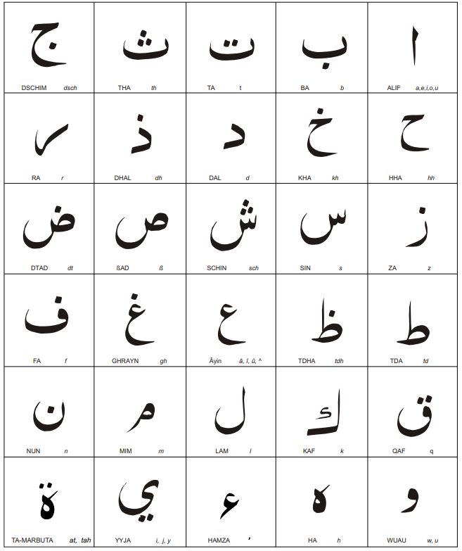 Das Arabische Alphabet hat 28 Buchstaben, welche sich in Verbindungen verändern. Geschrieben und gelesen wird von rechts nach links.