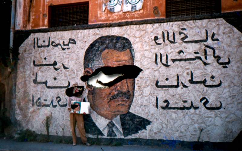 Notizbuch mit aufgeschlagenem Politikerbild vor Wandgemälde des selben nationalistischen Politikers. Nationalismus beruht grundsätzlich auf Rassismus in Kombination von unterschiedlichen Ideologien im Widerspruch zu spiritueller Lebensqualität.