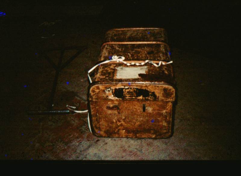 Alter Reisekoffer auf speziell angefertigtem Gestell mit Rollen um die nötige Forscherausrüstung im Krisentourismus - auch dort wo Autos nicht mehr fahren können - zu transportieren. Dieser Koffer war zu niedrig. Strassengel 1401 (1981)