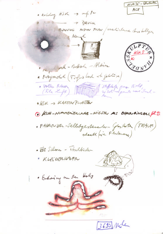 Die Durchreibung als Manifestation der Abwesenheit der Bildfläche. Ein Hinweis, auf den Bereich, der über die sinnliche Erfahrungen hinausreicht. Luft ist eines der Elemente der Malerei. Die Durchreibung produziert Abwesenheit der Bildfläche. Mittels solcher Lüftungen (Durchbohrungen, Herausschneidungen, Ausbrennungen usw.) in der Bildfläche entsteht ein Leer-Raum als eines der .Elemente der Malerei. Es handelt sich dabei nicht um ein "Hinzutun" sonder nun ein Wegnehmen durch welches nicht nur die Umgebung des Weggenommenen eine neue Bedeutung bekommt, sondern ein Schutz für die undarstellbare spirituelle Realität der Person, an deren Realität (die Seele) nur mehr transzendent hingewiesen wird. Luft gehört wie Feuer und Wasser zu den flüchtigen Elementen der Malerei, doch das Loch präsentiert auch das "Nichtsein" (La Makaan) bzw. die Abwesendheit eines Malgrundes so wie im Pullover das durchgescheuerte Stück, welches in das Grab mitgenommen wird und dort seine Realität zurückbekommt .. ... mehr. Technisch gesehen - sofern der Malgrund Papier ist - habe ich solange gerieben bis ein Loch entstand; bei Leinwandgemälden habe ich Löcher in die Leinwand geschnitten und bei Dias oder Negativen mit dem Lötkolben transzendiert.